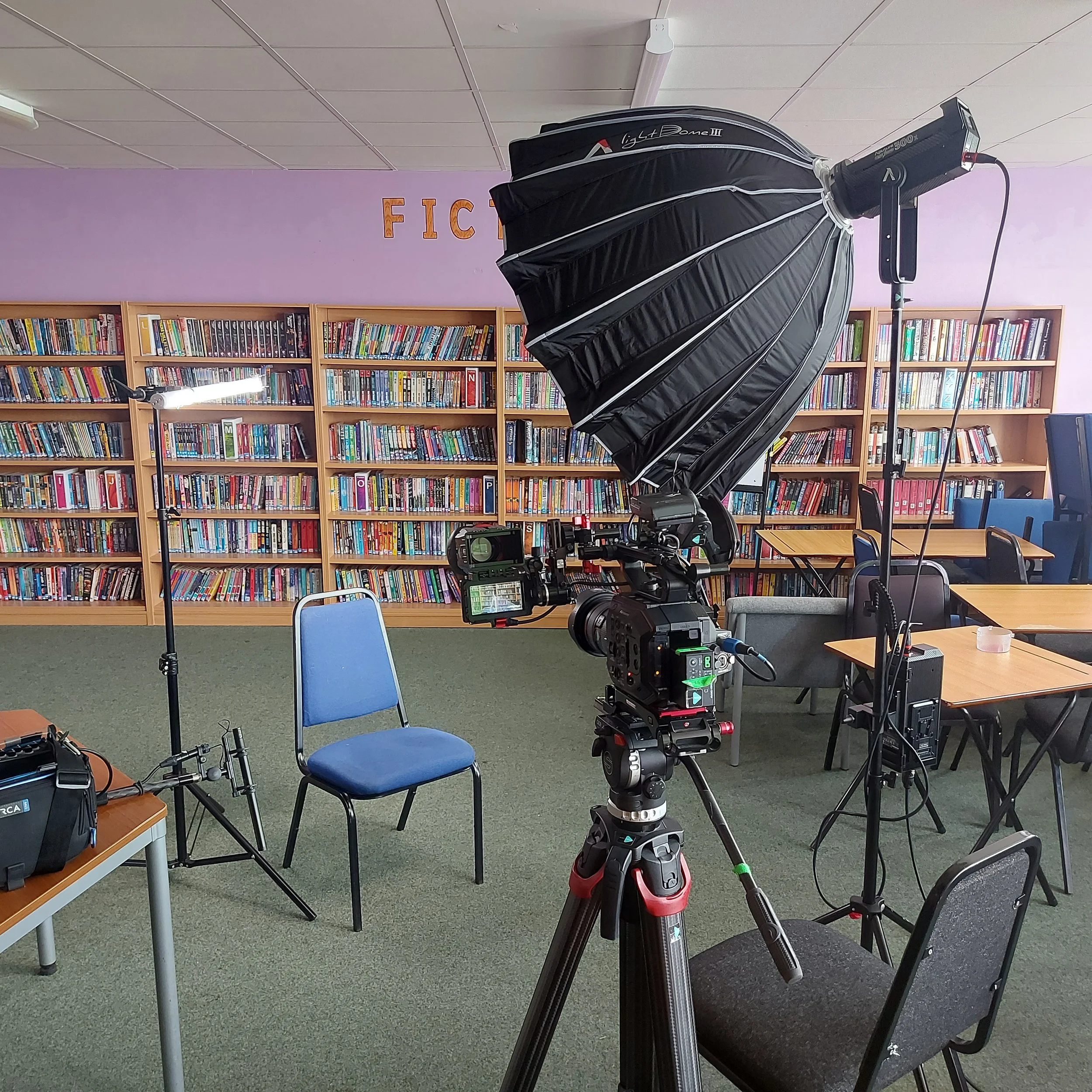 Libraries are great places to film interviews in schools because they're quiet and visually appealling